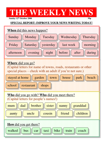 Once you know what your newspaper should look like create a new word document and add your newspaper s title at the top. Two days ago and once upon a time. Writing aid for news key words who where when etc. The final mat shows all the tricky words together.